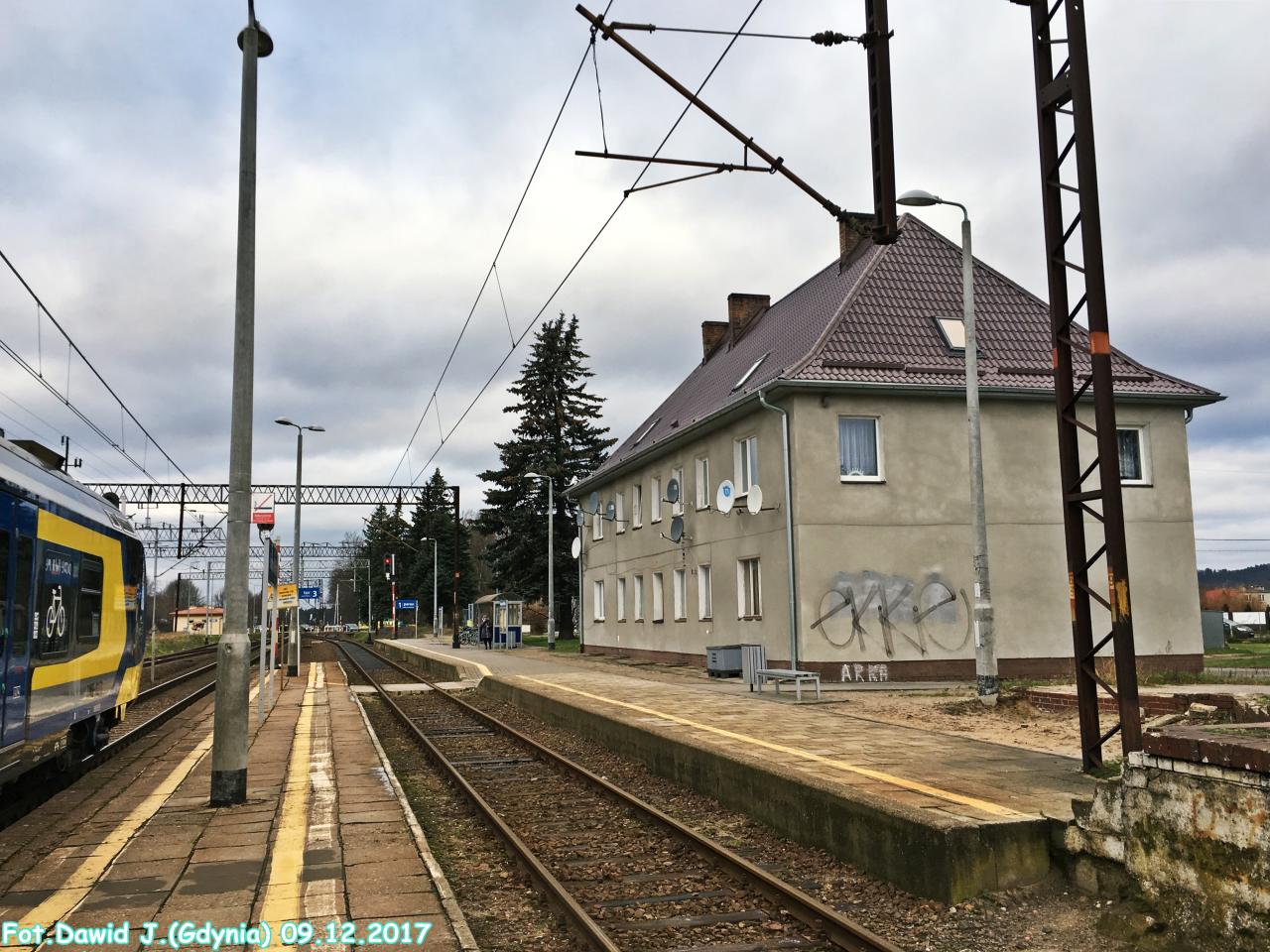Budynek dworca z częścią mieszczącą nastawnię dysponującą. Na ścianie zawieszony jest kasownik wraz z rozkładem (dwa kierunki: Lębork, Gdańsk Główny). Widok od strony peronów i wjazdu z Wejherowa.