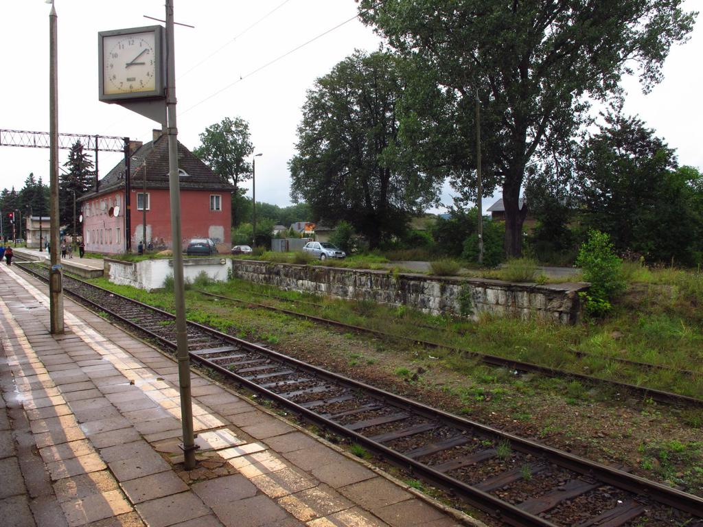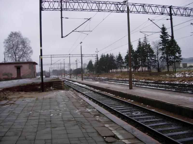 Widok na peron, rampę i w kierunku Lęborka/Słupska. Kolejowy budynek mieszkalny (ul. Lęborska 4) znajduje się po prawej stronie.