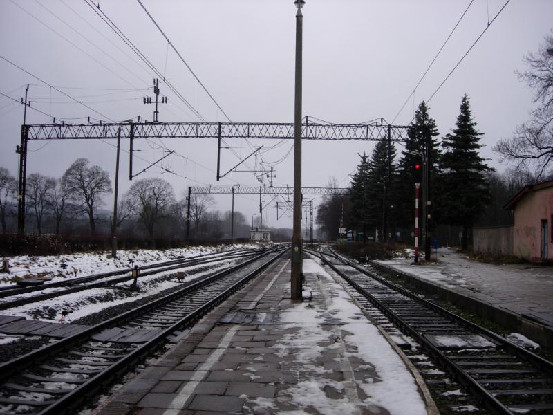 Widok z końca peronu 2 w kierunku Lęborka/Słupska. Semafory wyjazdowe "E, F, G". Na końcu peronu 1 znajdował się budynek dworca z nastawnią dysponującą - obiekt nie istnieje.