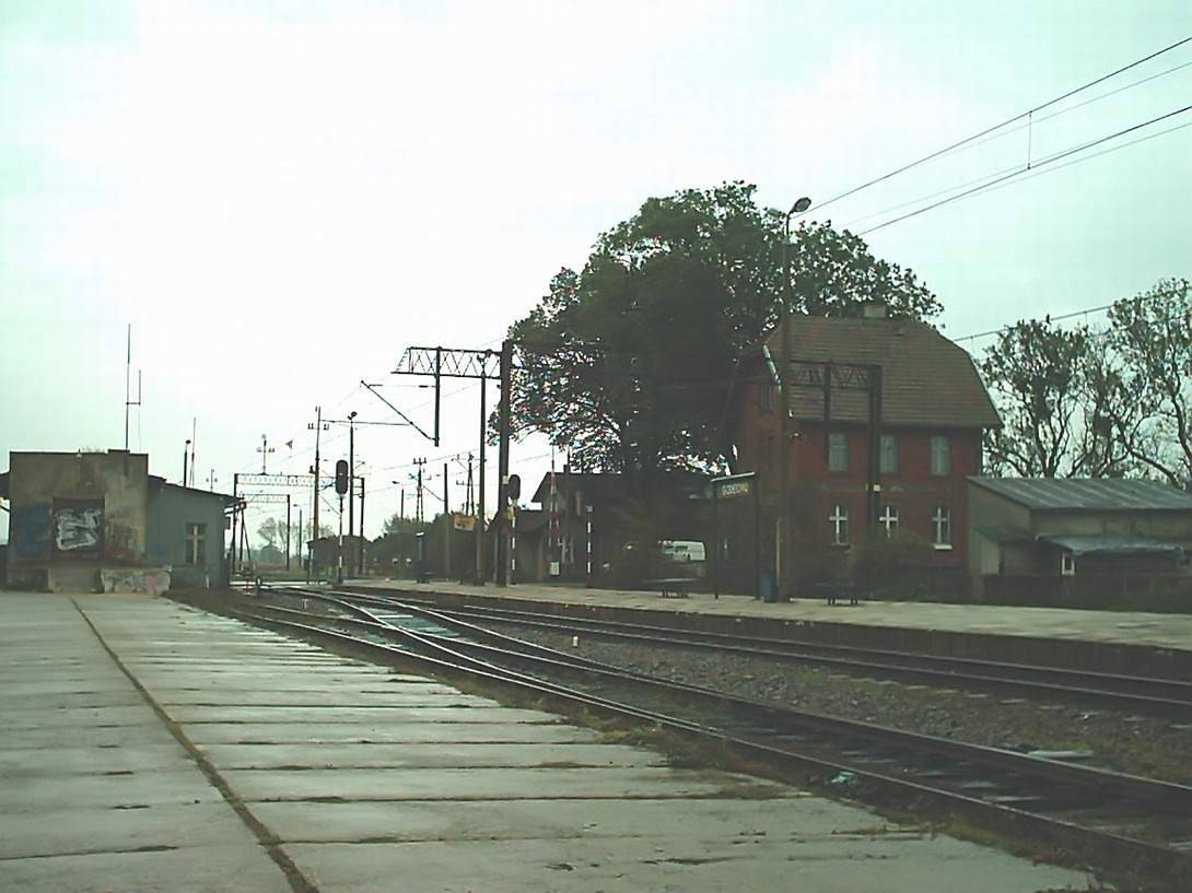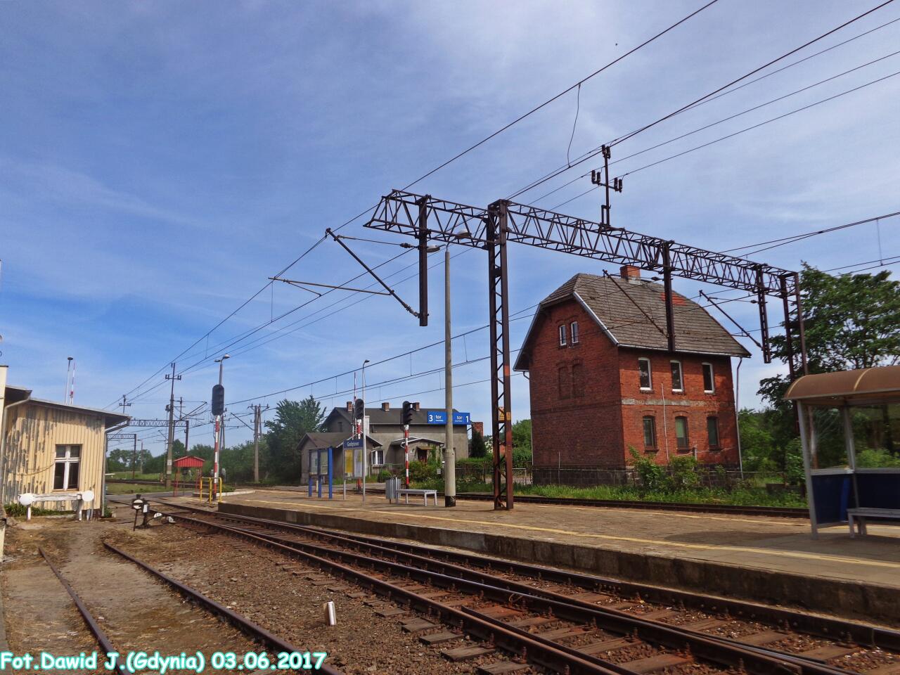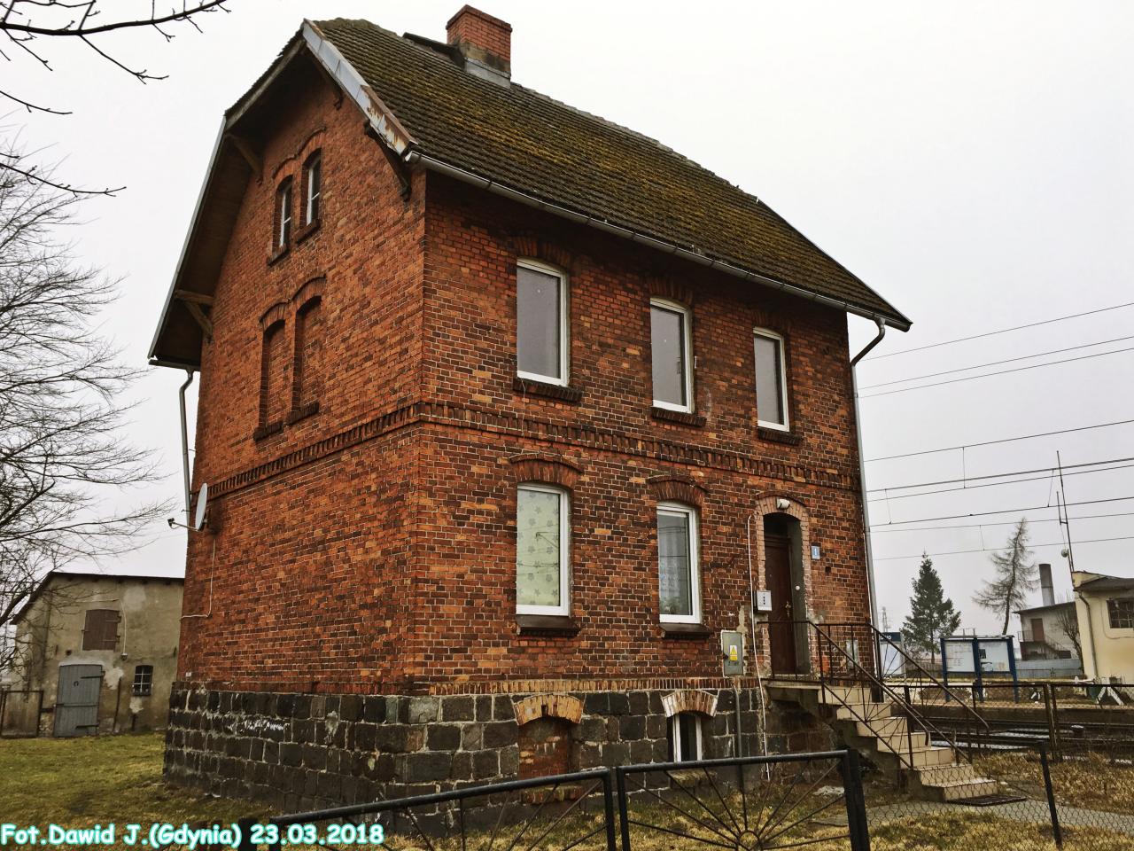 Budynek dworcowy i budynek małego magazynu. Obiekty widoczne od strony torów. W lewo Lębork/Słupsk, w prawo Wejherowo/Gdynia Główna.