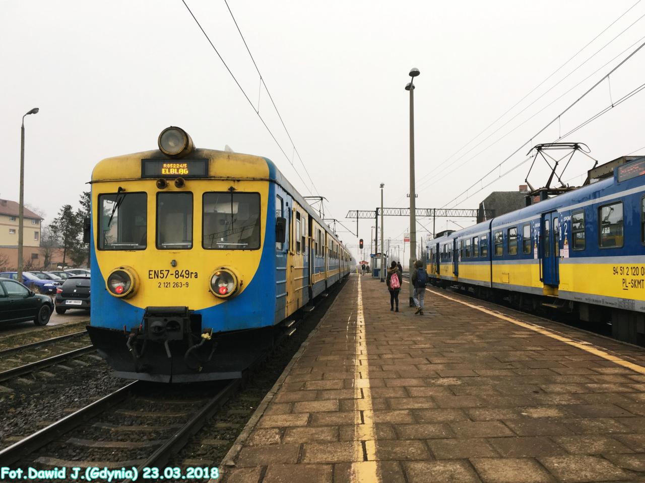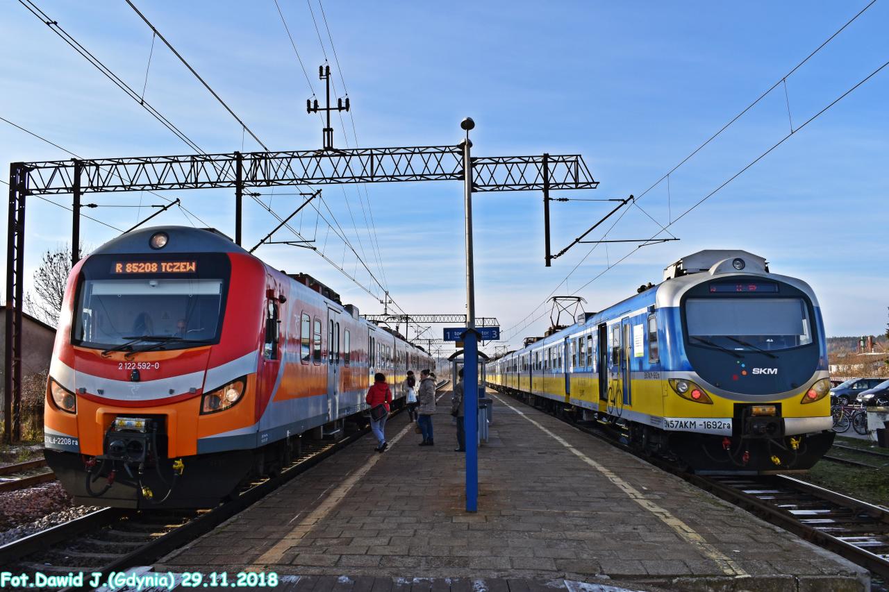 Widok z peronu w kierunku Wejherowa/Gdyni Głównej. Mijanka EZT.