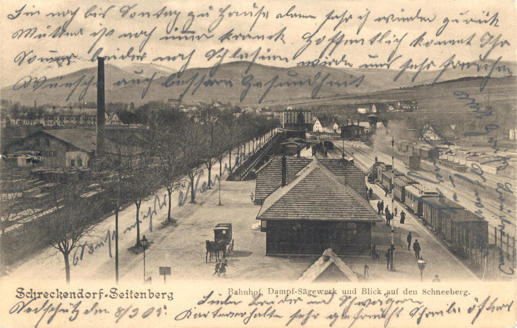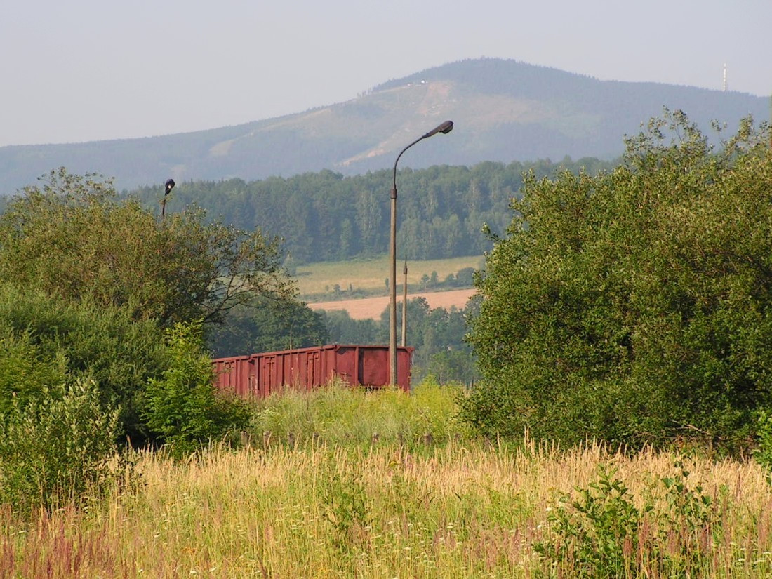 Węglarki na bocznicy tartaku z widoczną w tle Czarną Górą.