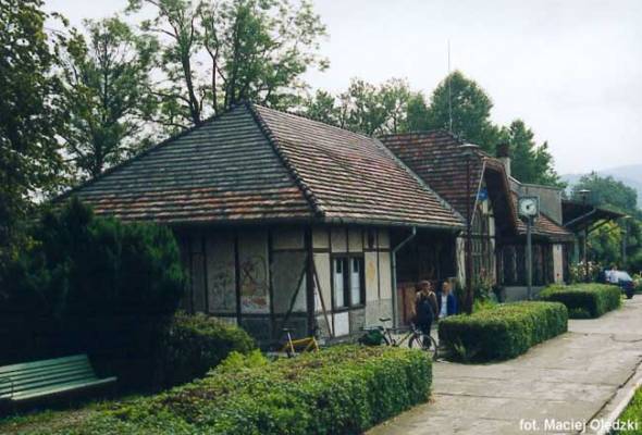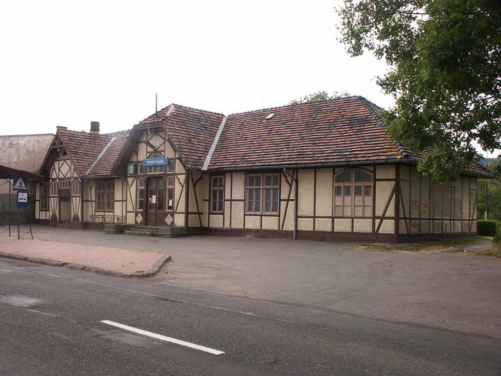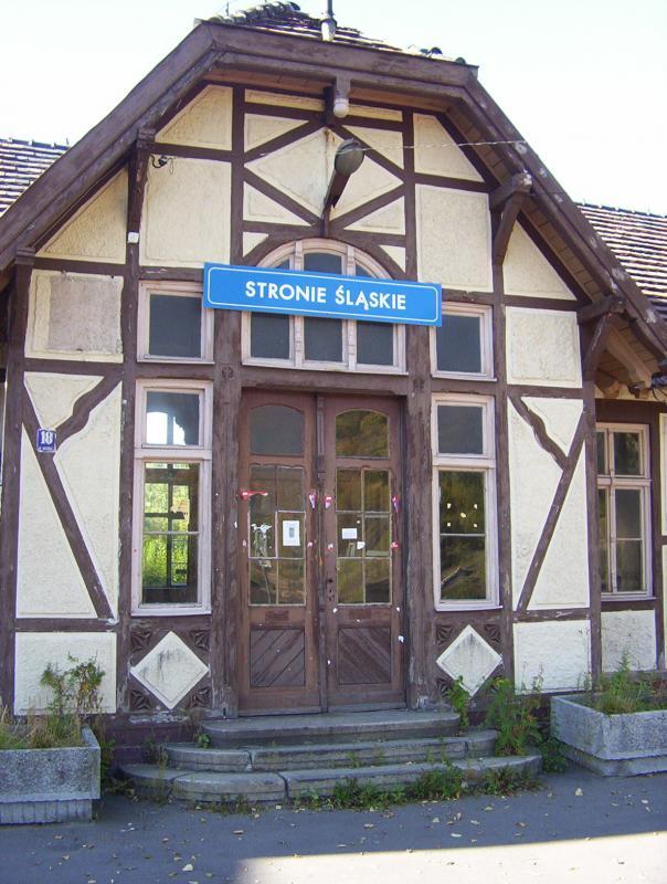 Widok na budynek dworca od strony peronów. W lewo Lądek-Zdrój.