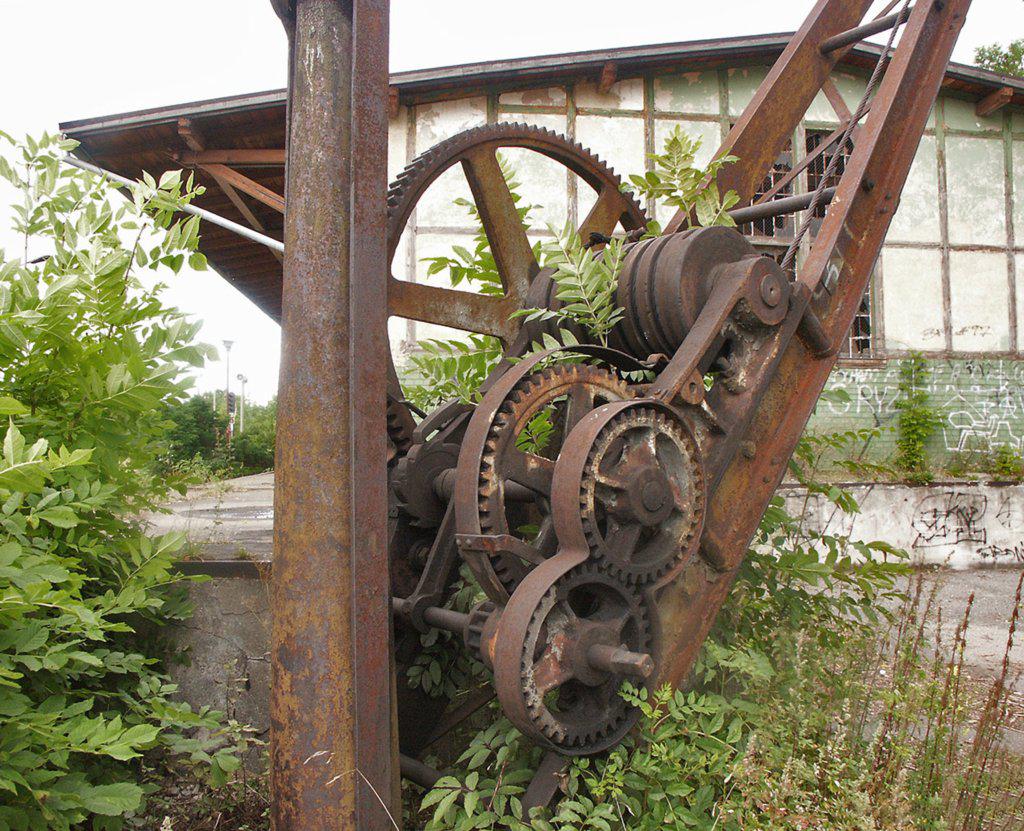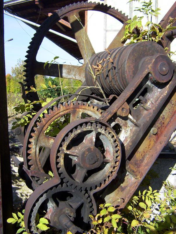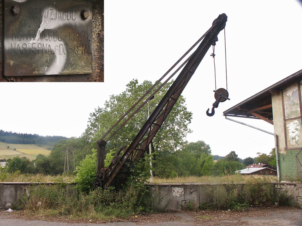 Mechanizm żurawia przeładunkowego, położonego przy magazynie towarowym (w tle).