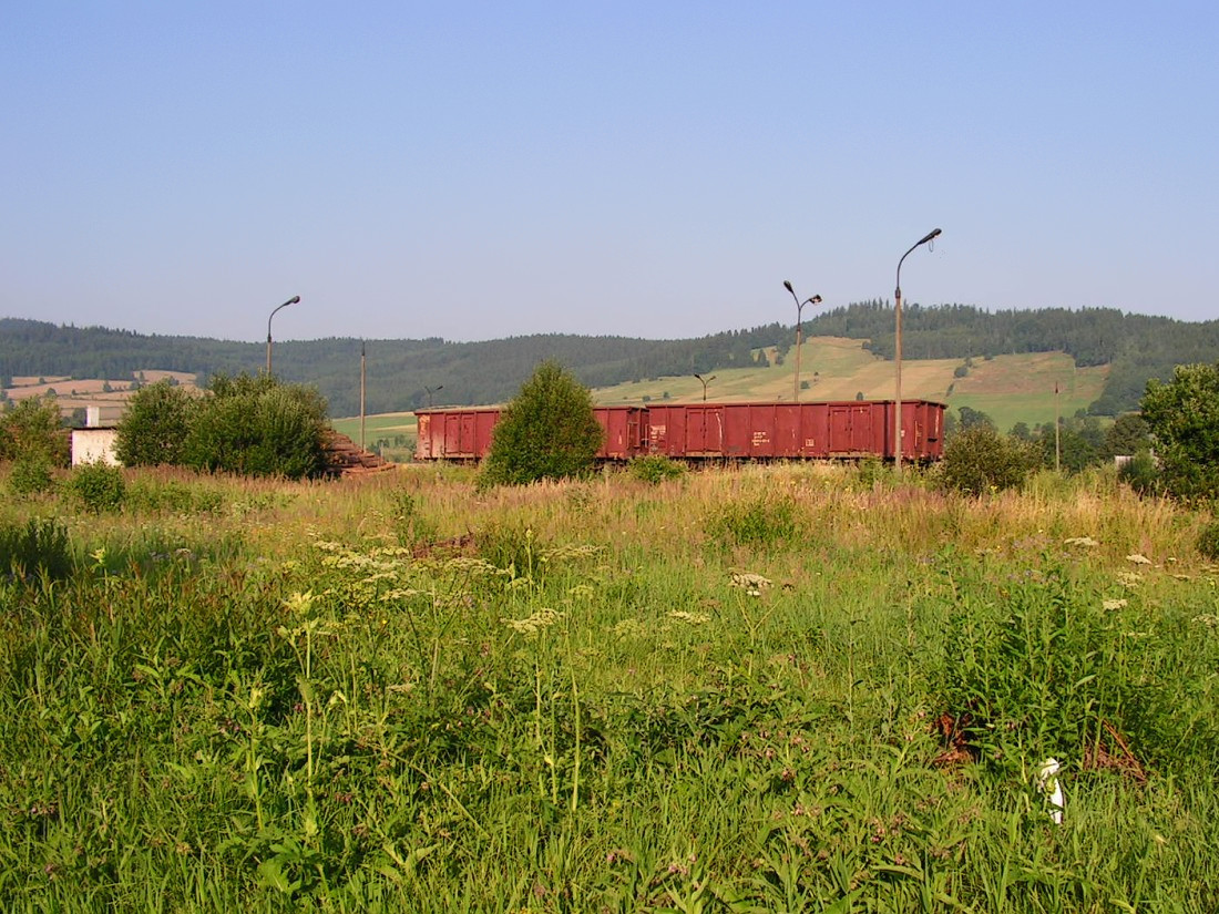 Załadowane wagony z drewnem na bocznicy przy stacji Stronie Śląskie. Po zawieszeniu ruchu osobowego w 2004r. jeszcze przez kilka lat stacja funkcjonowała dzięki transportowi drewna.