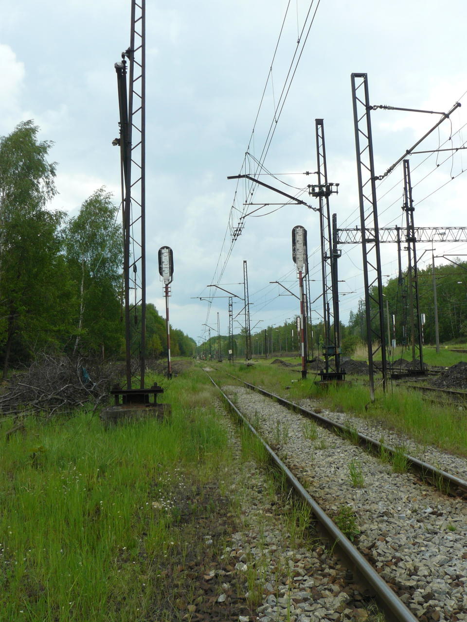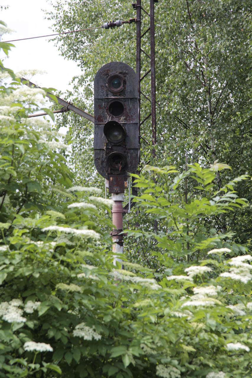 Semafor wyjazdowy z toru dodatkowego (?) przy peronie. Tor cały zarośnięty, braki w łączeniach szyn.
