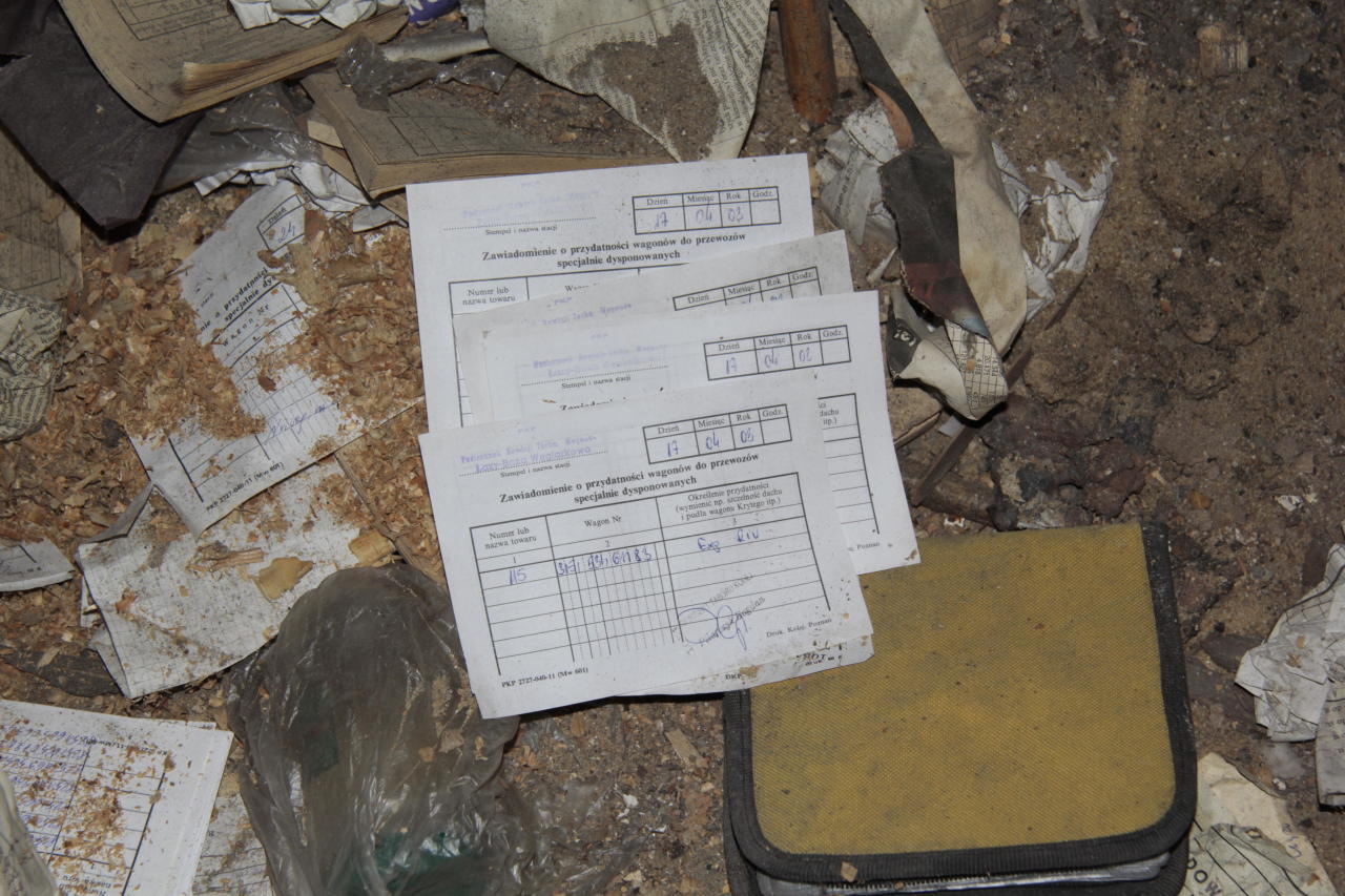 Dokumenty kolejowe porozrzucane w magazynie stacyjnym.