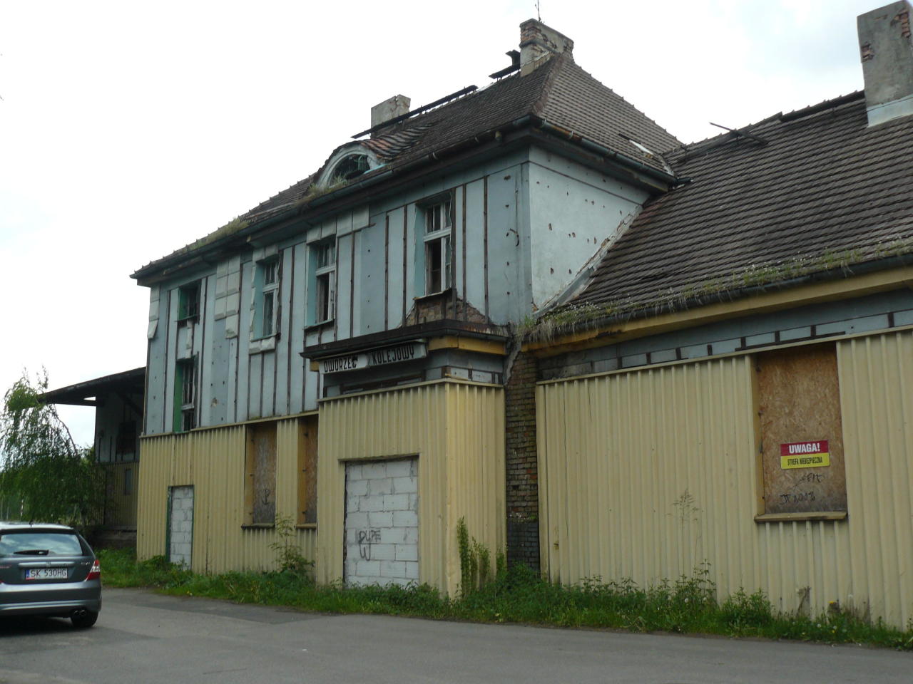 Budynek stacyjny od strony torów. W murze widoczne otwory po elewacji (panelach), którą widać na poprzednich zdjęciach,