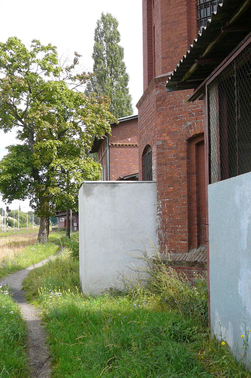 Recz Pomorski. Kolejowa wieża wodna przy budynkach stacyjnych w 1998 r., z murem ochronnym przed wejściem.