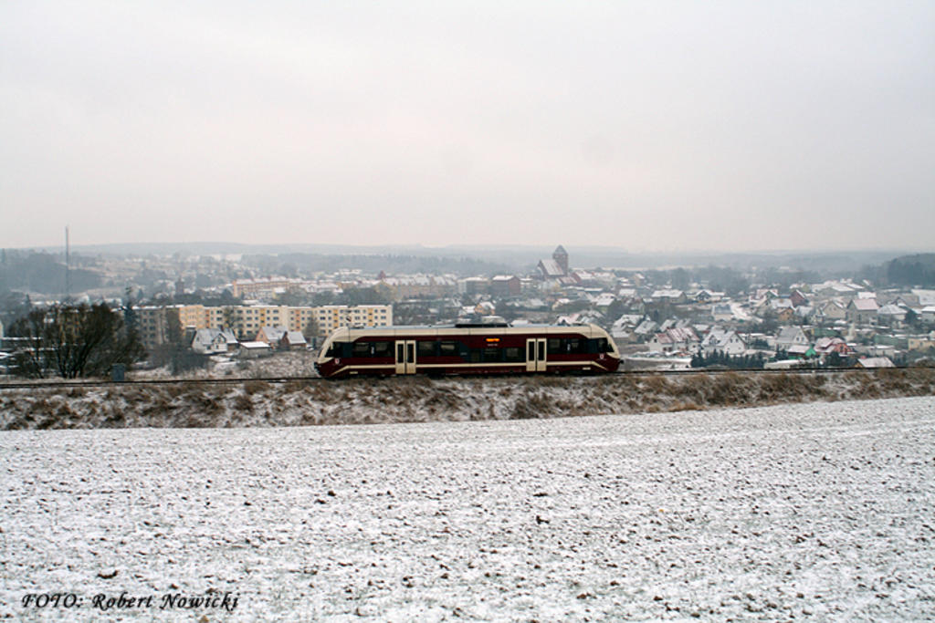 SA 103 010 jako pociąg osobowy relacji Stargard Szczeciński - Kalisz Pomorski Miasto za chwilkę wjedzie na stację Recz. W tle miasto w całej okazałości.