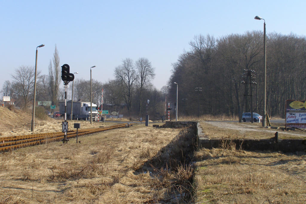 Recz. Pom. Widok z peronu w stronę Kalisza Pom. - jeden z pierwszych na tej linii systemu tarcz przejazdowych, w oddali przejazd i przejeżdżający TIR;