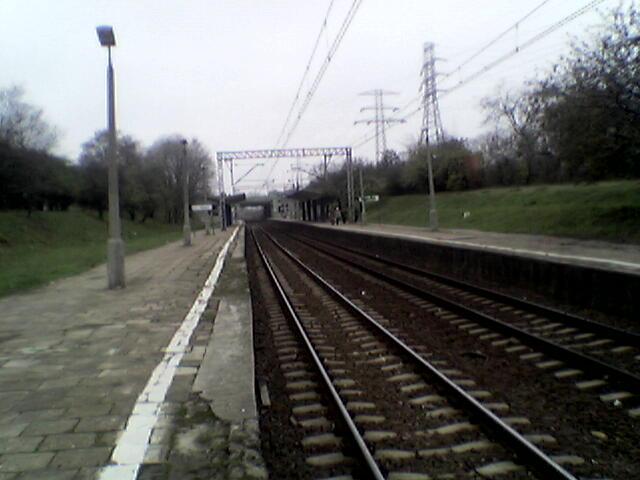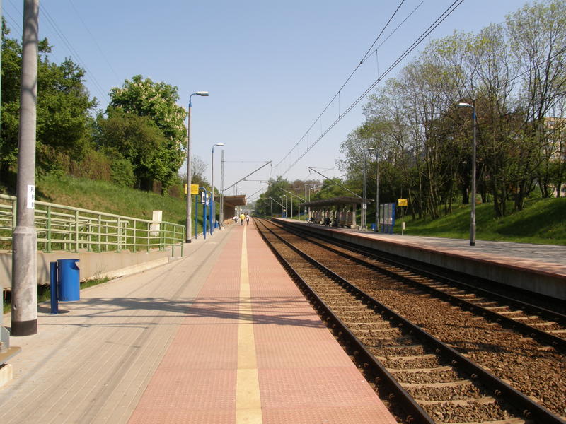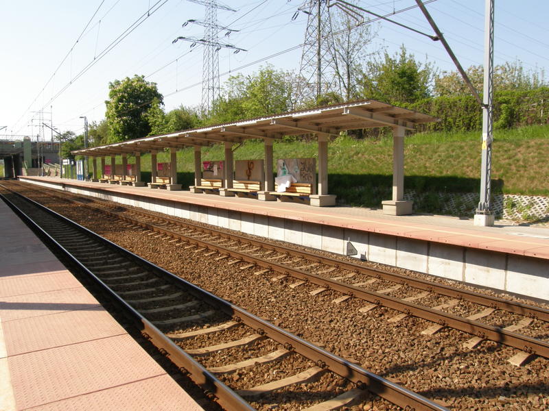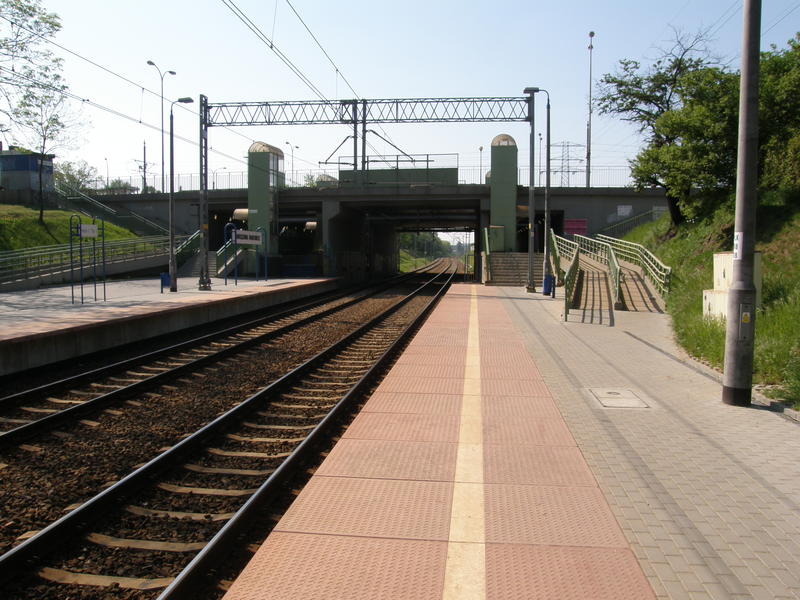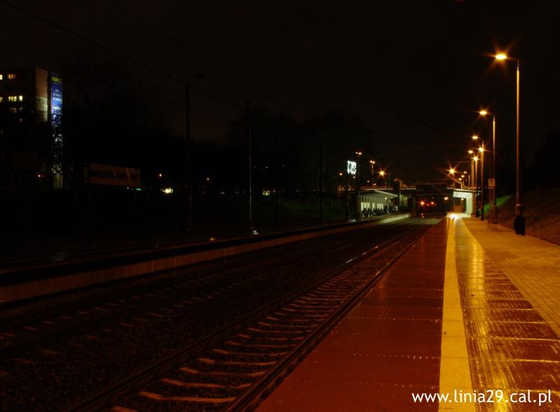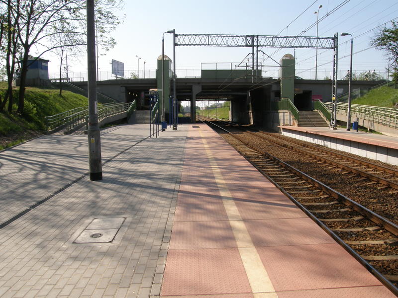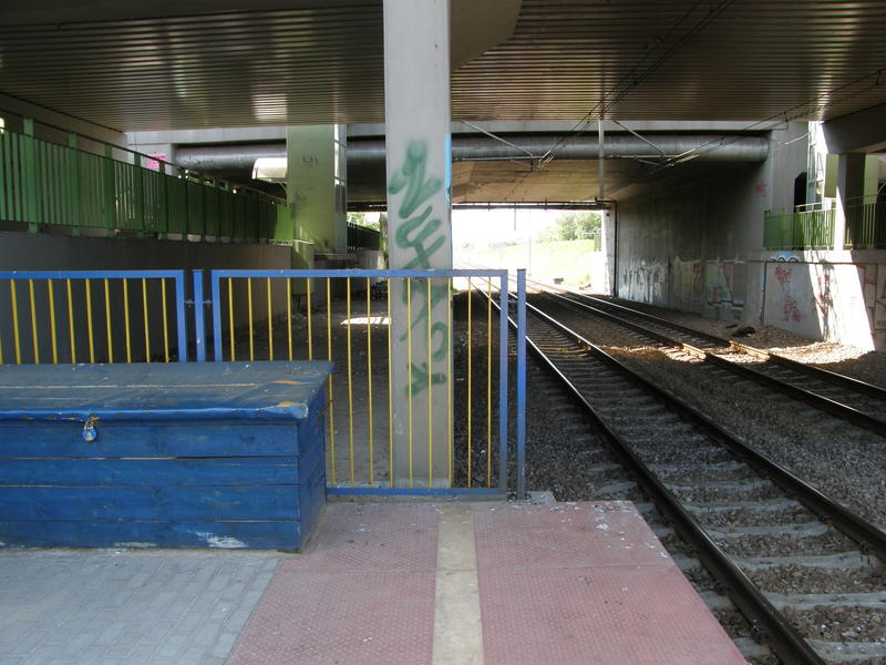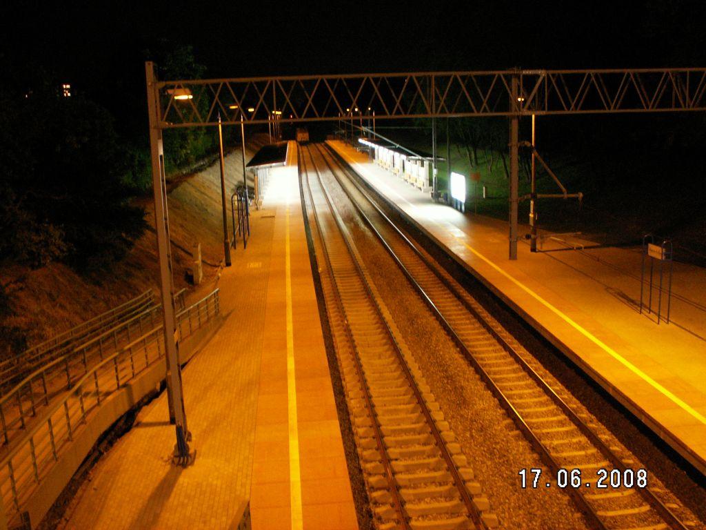Peron. Pod wiaduktem jest miejsce na trzeci tor. Widok w kierunku Warszawy Alej Jerozolimskich.