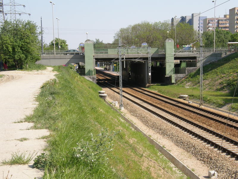 Wiadukt w ciągu ulicy Grójeckiej i Alei Krakowskiej. Pod wiaduktem jest miejsce na trzeci tor. Widok w kierunku Warszawy Żwirki i Wigury (Radomia). Na górze po prawej kasa biletowa.
