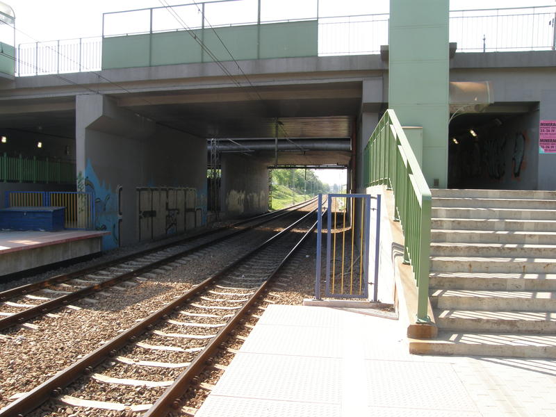 Południowe przejście pod wiaduktem w kierunku od peronu. Pod wiaduktem jest miejsce na trzeci tor. Widok w kierunku Warszawy Alej Jerozolimskich.