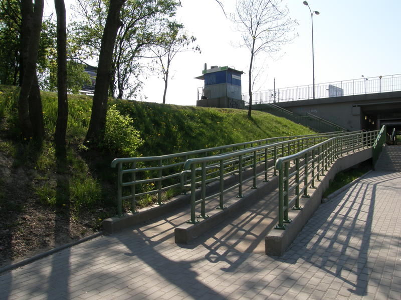 Warszawa Rakowiec. Zejście na peron II z Alei Krakowskiej. Widok w kierunku Warszawy Okęcia.