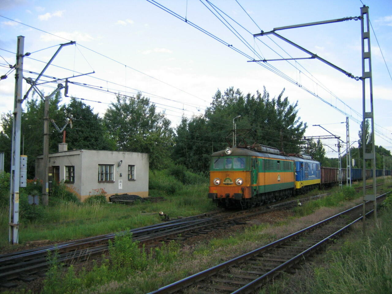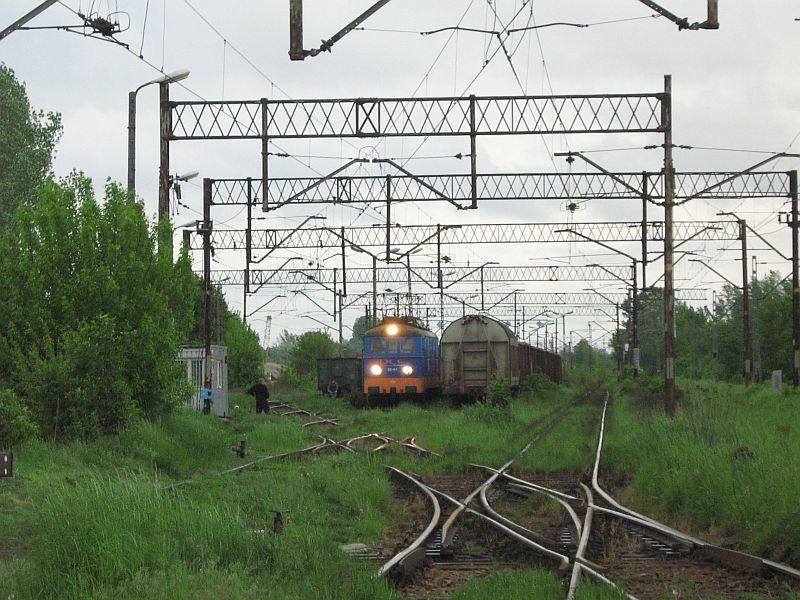 Warszawa Okęcie. Lokomotywa PCC Rail ze składem towarowym oczekuje na sygnał wyjazdu z grupy torów towarowych stacji.