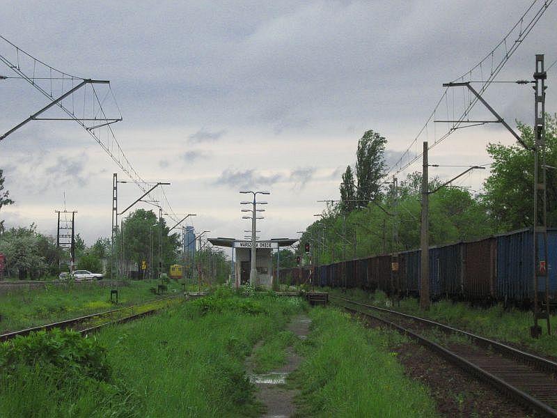 Widok w kierunku Warszawy Służewca. Mały budynek po prawej to nastawnia OK1. Tor nr 1 zamknięty w związku z budową linii do Warszawa Służewiec - Lotnisko Okęcie.