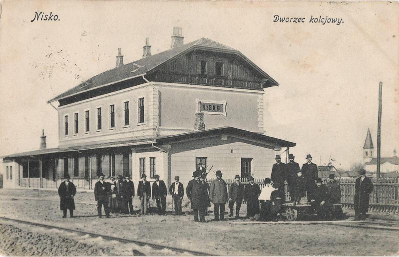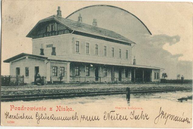 Budynek dworca w Nisku ok. 1900 roku. Widok od strony peronów; w prawo Przeworsk, w lewo Stalowa Wola.