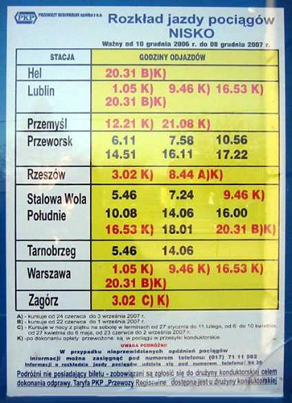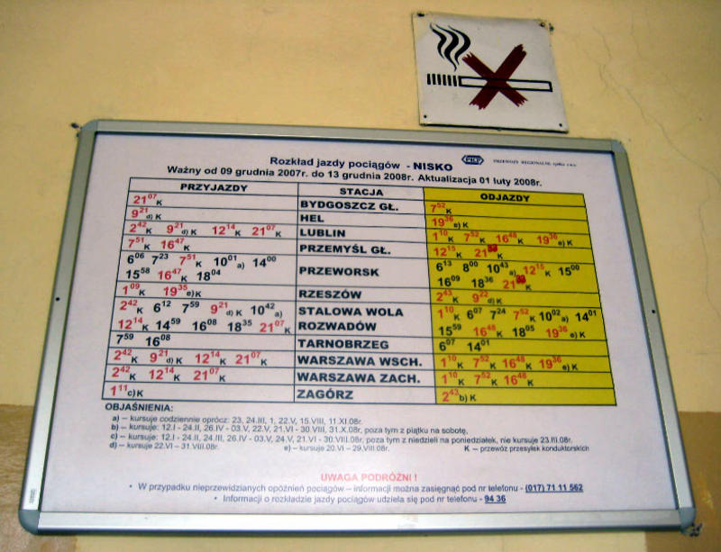 Stacja PKP Nisko. Rozkład jazdy w budynku dworcowym. Uwzględniono aktualizację od 1 lutego 2008 roku.