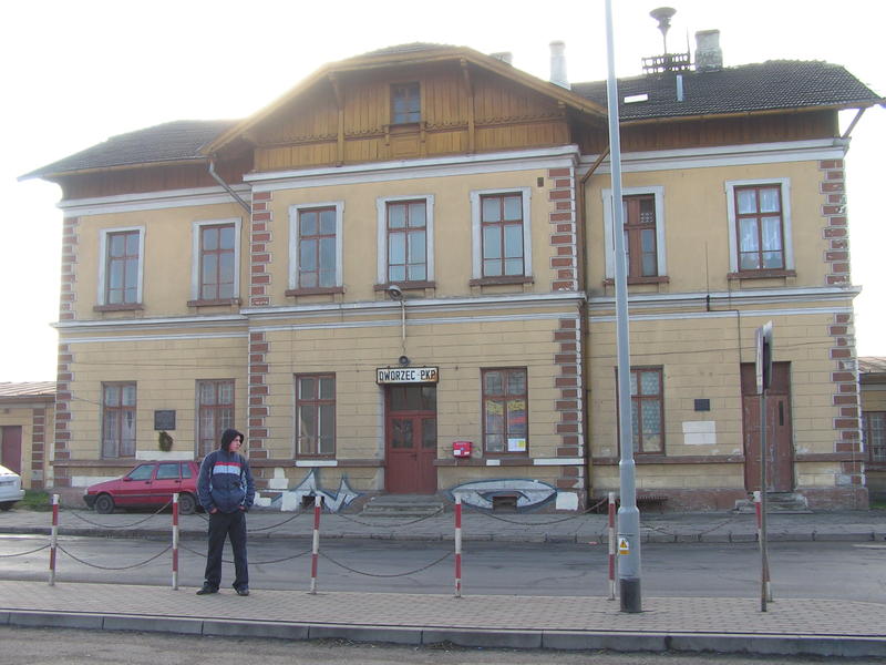 Dworzec od strony miasta, ul. Kolejowa, umieszczony po północnej stronie torów.