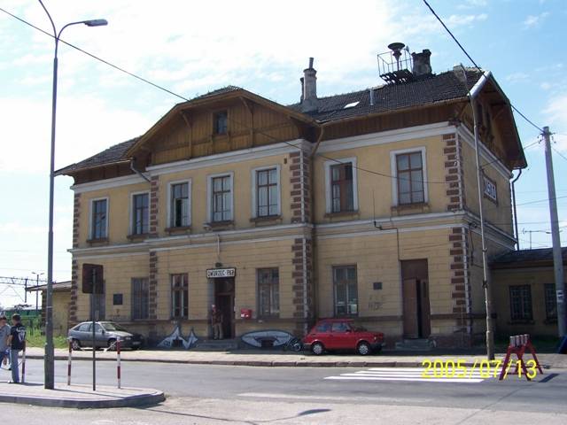 Budynek dworca od strony torów; w prawo Przeworsk, w lewo Stalowa Wola. Zdjęcie z placu ładunkowego.