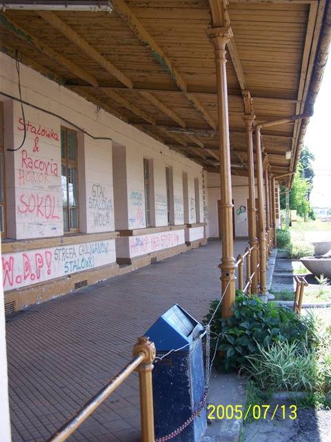Wiata przed budynkiem stacyjnym z zachowanym ogrodzeniem. Kto jeszcze pamięta te czasy, jak na teren stacji nie można było wejść bez ważnego bilety lub peronówki, a przy wychodzeniu ze stacji oddawało się bilet kolejarzowi, który stał właśnie przy furtce, w takim ogrodzeniu.