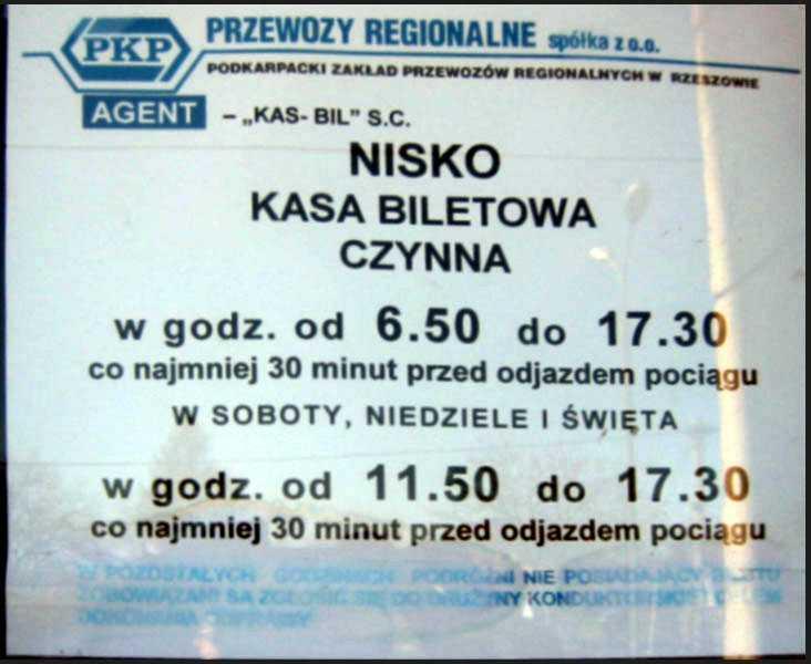 Stacja PKP Nisko. Kasa biletowa w budynku dworcowym. Czynna 30 minut przed odjazdem pociagów.