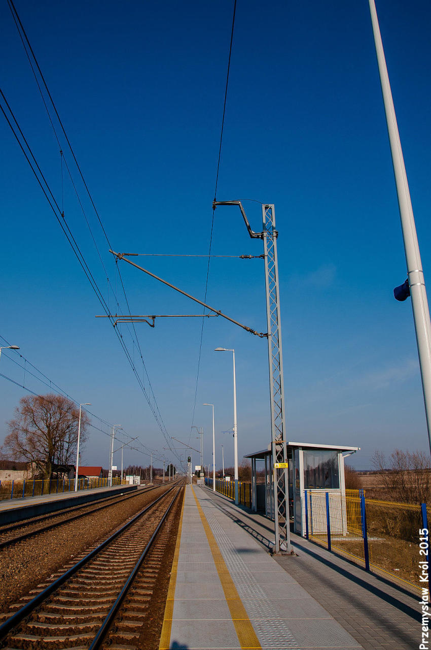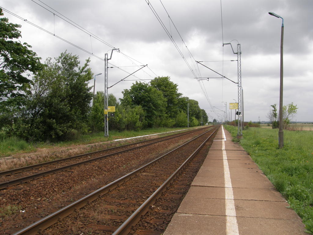 Perony boczne nie mają żadnej wiaty, są tylko ławki. W lewo Piotrków Trybunalski, w prawo Radomsko. 171,6 km.