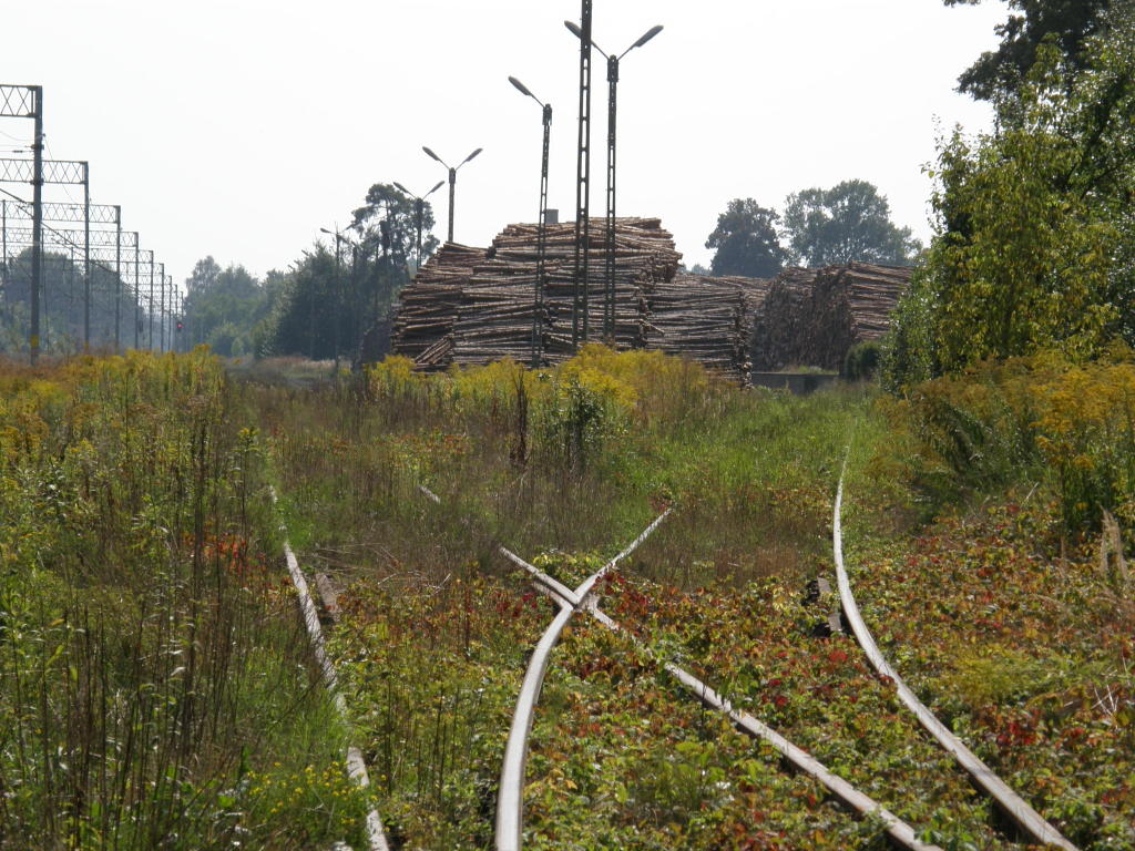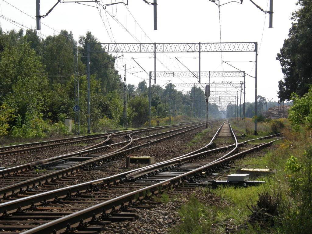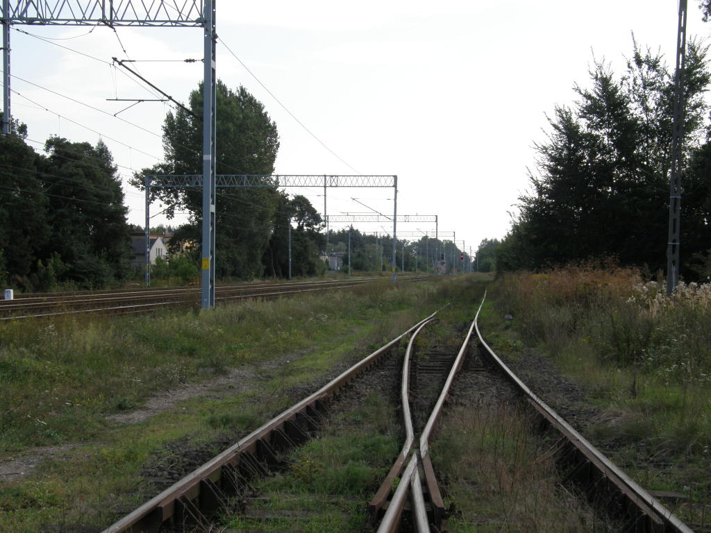 Północna głowica rozjazdowa; wyjazd na Piotrków Trybunalski. Po prawej zakład wytwarzania tworzyw sztucznych Erigs S.A, który ma bocznicę kolejową. Po lewej poza kadrem kabina sekcyjna. Widok w kierunku Radomska. 176,4 km.
