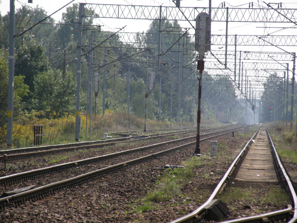 W oddali północna głowica rozjazdowa; wyjazd na Piotrków Trybunalski. Widok w kierunku Radomska. 176,3 km.
