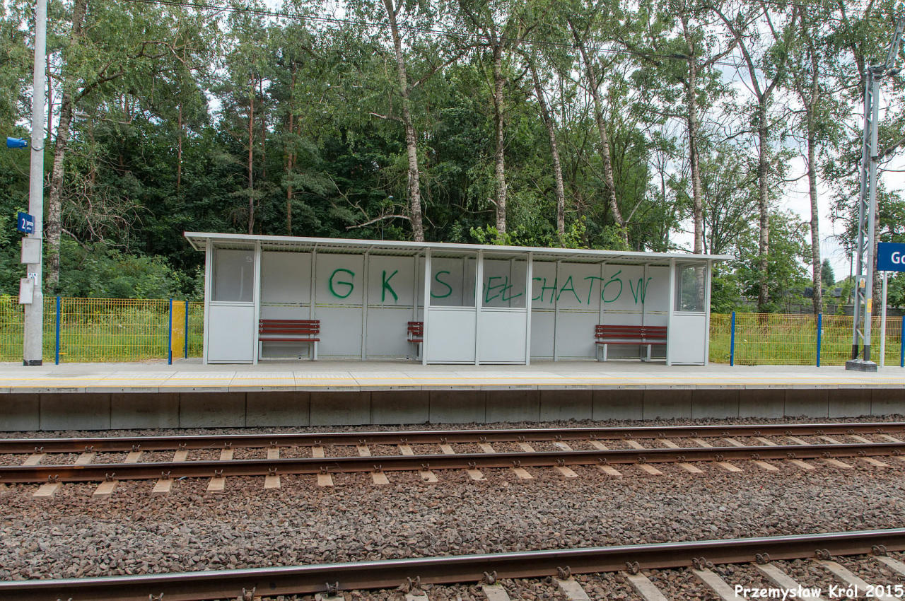 Perony. Wiata na peronie dla pociągów w kierunku Piotrkowa Trybunalskiego. W oddali jedyna na stacji nastawnia Gm. Widok w kierunku Piotrkowa Trybunalskiego. 177,7 km.