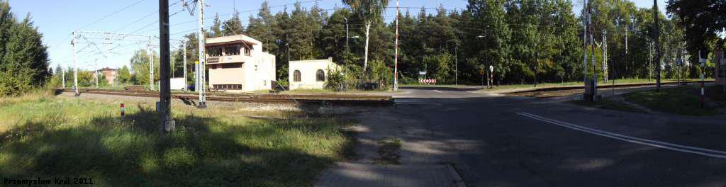 Jedyna na stacji nastawnia Gm. Przejazd drogowy w ciągu ulicy Wojska Polskiego. Po lewej poza kadrem budynek dworcowy. Widok w kierunku Piotrkowa Trybunalskiego. 177,6 km.
