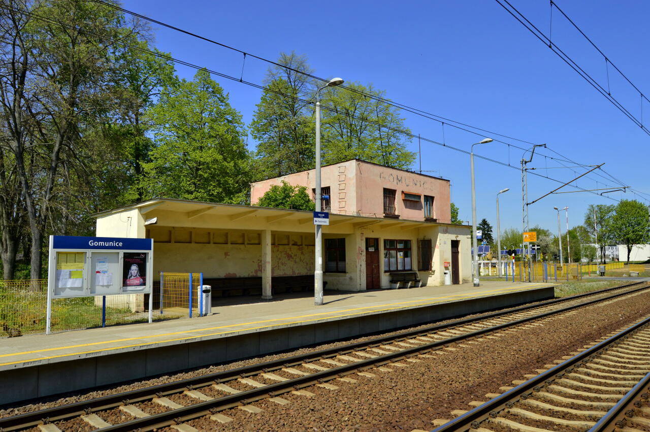 Budynek dworca od strony peronów; w lewo Radomsko, w prawo Piotrków Trybunalskich.