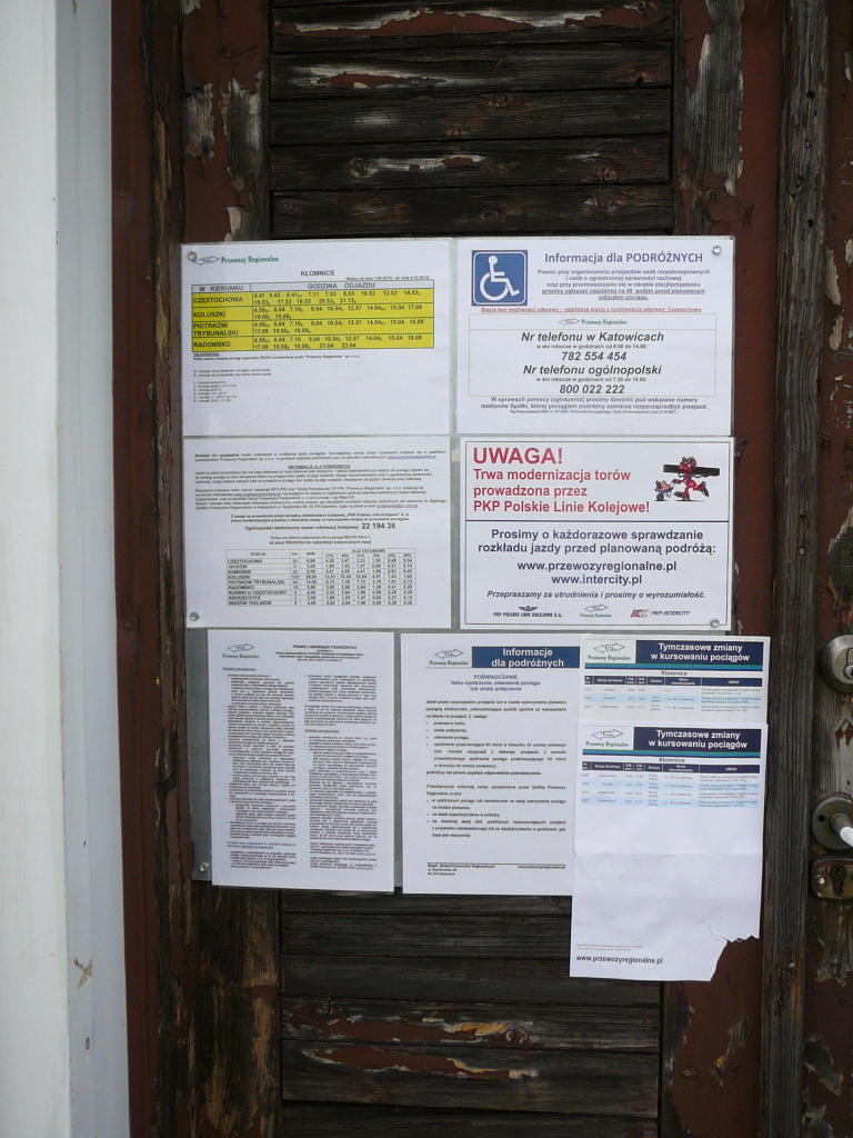 Kłomnice. Informacja na drzwiach budynku dworca.