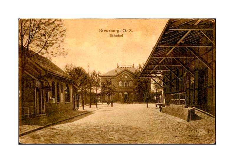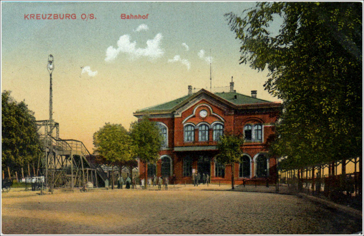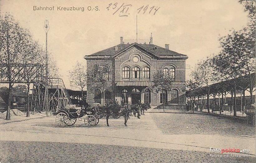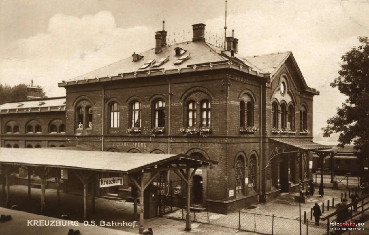 Budynek dworca od strony podjazdu. Z prawej perony 1 i 2 (zachodnie), w lewej perony 3 i 4 (wschodnie). Widok w kierunku południowo-wschodnim, od strony wjazdów z Namysłowa/Wrocław (perony 1 i 2) i Kępna/Poznania (perony 3 i 4). Przed dworcem trwają jakieś uroczystości.