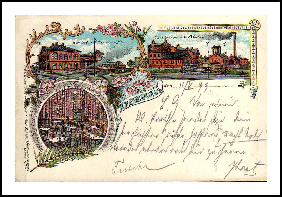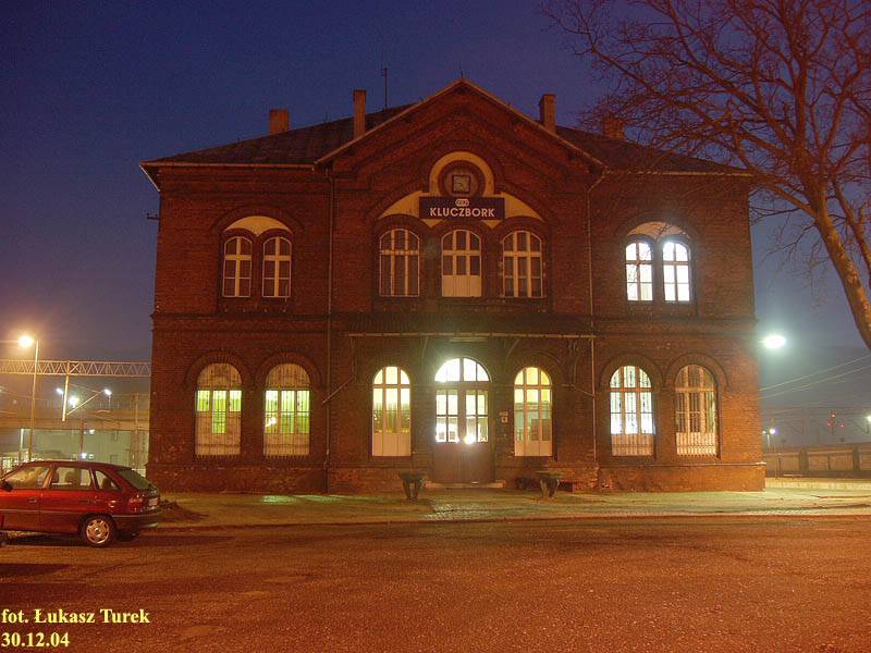W lewym-górnym polu widok na budynek dworca od strony północno-zachodniej. W prawym-górnym polu dawna gorzelnia w Kluczborku, które pozostałości stoją do dziś przy ul. Wołczyńskiej, na północ od "Wagremu". Do dziś prowadzi tam bocznica kolejowa. Widoczny jest także fragment układu torowego wschodniej części stacji. Stara pocztówka.