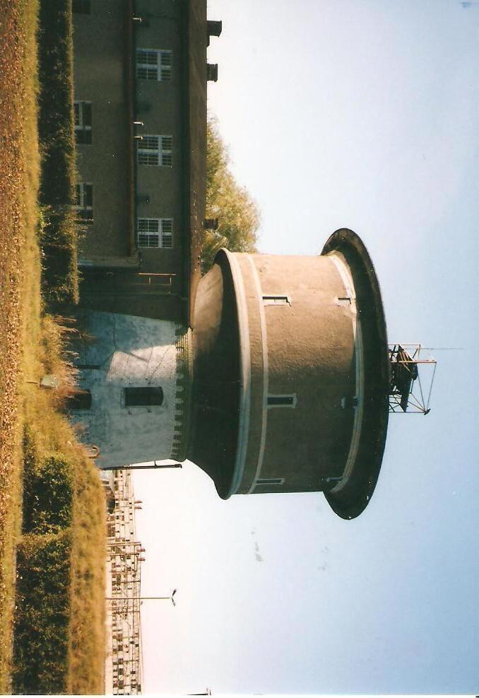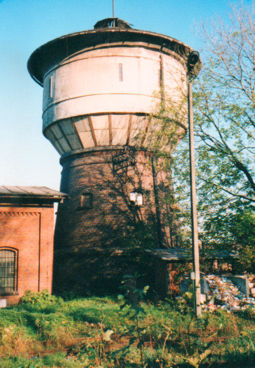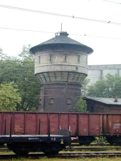 Kluczbork. Wieża wodna południowo-wschodnia przy lokomotywowni. Widok od strony torów wjazdowych z Olesna/Katowic, w kierunku północno-zachodnim.