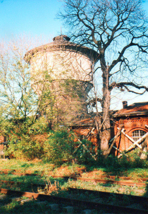 Kluczbork. Wieża wodna południowo-wschodnia przy lokomotywowni. W prawej widoczne tory wjazdowe z Olesna/Katowic. Z lewej, niewidoczne tory z Jełowej/Opola i Fosowskiego. Widok w kierunku północnym.