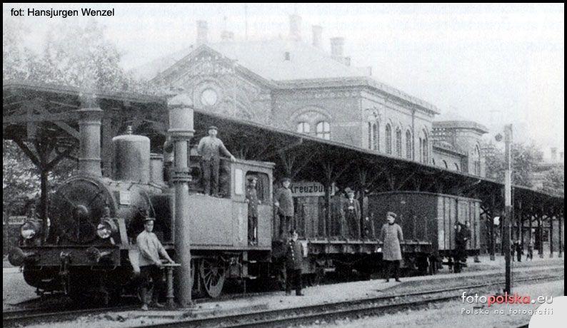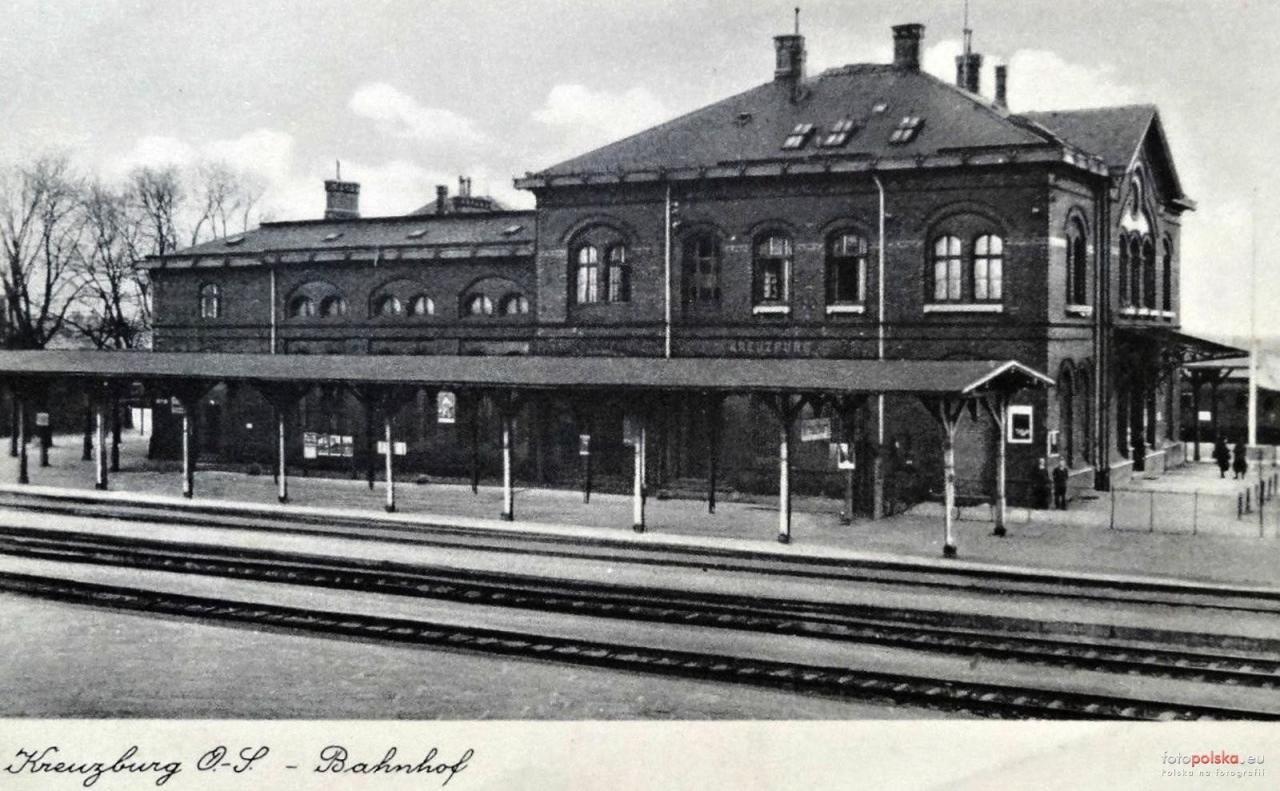 Widok na dworzec kolejowy od strony podjazdu w kierunku południowo-wschodnim. Ciekawostką jest fakt zlokalizowania ongiś kładki dla pieszych z tej (południowej) strony dworca. Obecnie kładka znajduję się po jego przeciwnej stronie. Z lewej strony wschodnie perony 3 i 4, obsługujące pociągi z/do Ostrowa Wielkopolskiego. Z prawej strony zachodnie perony 1 i 2, obsługujące pociągi z/do Wrocławia oraz Opola. Stara pocztówka.