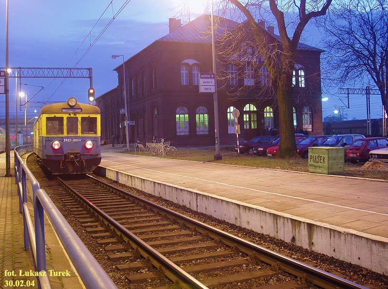 Budynek dworca i perony wschodnie: z lewej 4, z prawej 3, przy którym stoi EN57-990 do Katowic. Widok w kierunku południowo-wschodnim: Fosowskie, Jełowa/Opole, Olesno/Katowice.
