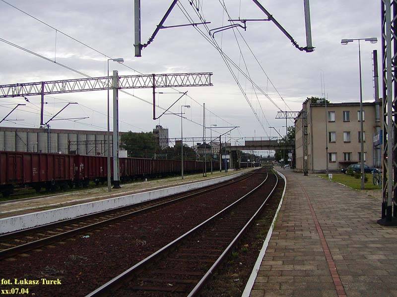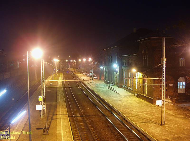 Perony zachodnie: 1 (z prawej) i 2 (z lewej). W tle kładka nad torami i elewator zbożowy. W budynku po prawej znajduje się posterunek SOK. Widok w kierunku północno-zachodnim, od strony wjazdów z Fosowskiego, Jełowej/Opola, Olesna/Katowic.