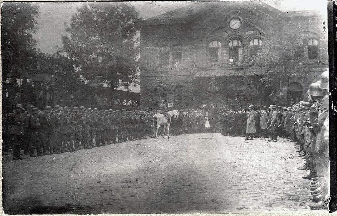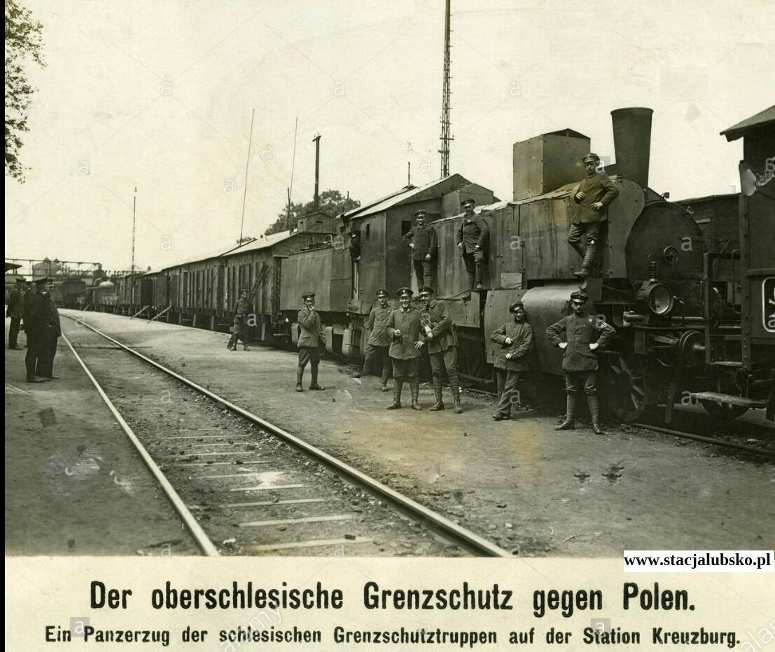 Pociąg pancerny na stacji kolejowej w Kluczborku (w tle widoczna kładka nad torami) należący do niemieckiej straży granicznej/Grenschutz. Pociąg ten prawdopodobnie wspierał Niemców walczących w maju 1921 roku z powstańcami polskimi na stacji kolejowej Kostów. Powstańcy polscy przybyli z okolic Kępna i Wielunia aby przyłączyć teren do Polski. Prawdopodobnie byli finansowani przez Szembeków z Siemianic. Na skutek interwencji pociągu pancernego polscy powstańcy ponieśli duże straty osobowe (ok. 20 poległych i rannych) i zmuszeni byli do wycofania się z Kostowa. Pociąg operował w czasie III Powstania śląskiego w ok. Kluczborka.
