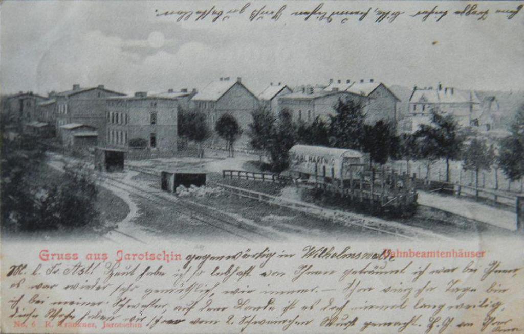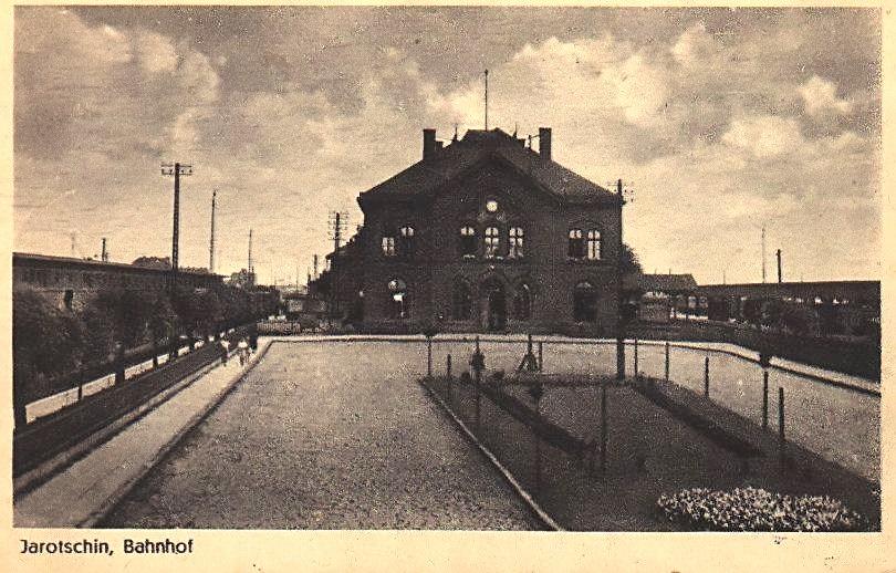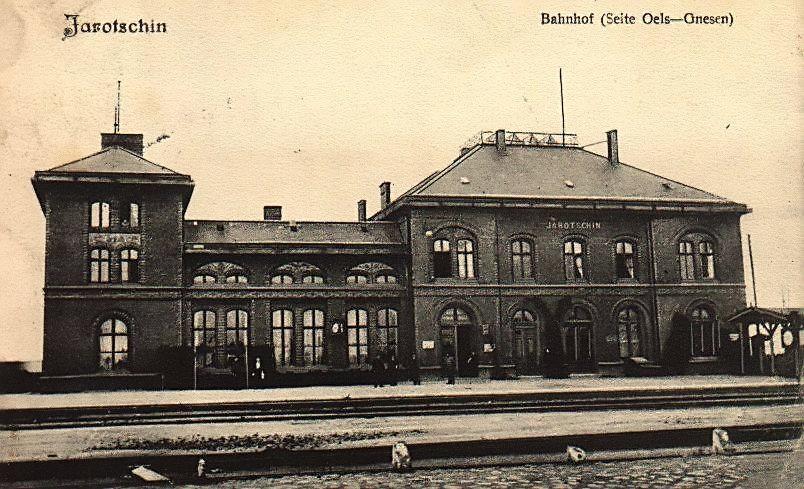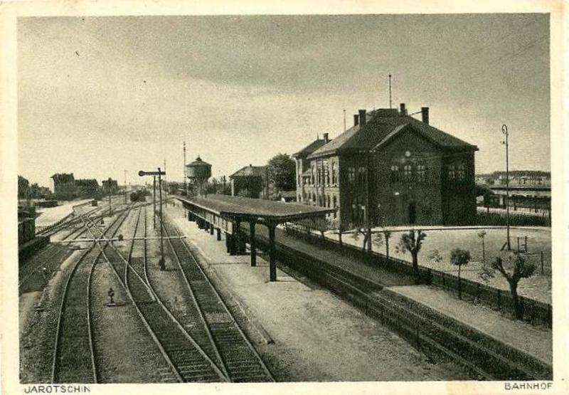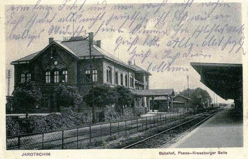 Jarociński dworzec od strony peronów. Wschodnia strona dworca z peronami 3 i 4, przeznaczonymi do obsługi ruchu na linii 281. Widok w kierunku północno-zachodnim; w prawo Września, w lewo Ostrów Wielkopolski, Krotoszyn. Pocztówka ze strony http://www.staredworce.friko.pl/