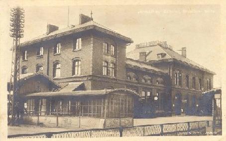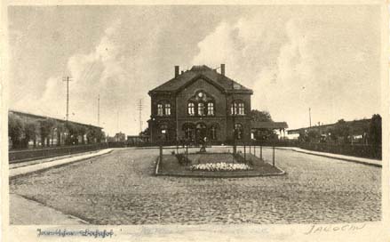 Budynek dworca od strony podjazdu. Widok w kierunku południowym. Z lewej perony wschodnie (od prawej: 3 i 4), przeznaczone do obsługi ruchu na linii 281. Z prawej perony zachodnie (od lewej: 3a, 1, 2), przeznaczone do obsługi ruchu na liniach 272, 360, 361. Pocztówka ze strony http://www.staredworce.friko.pl/