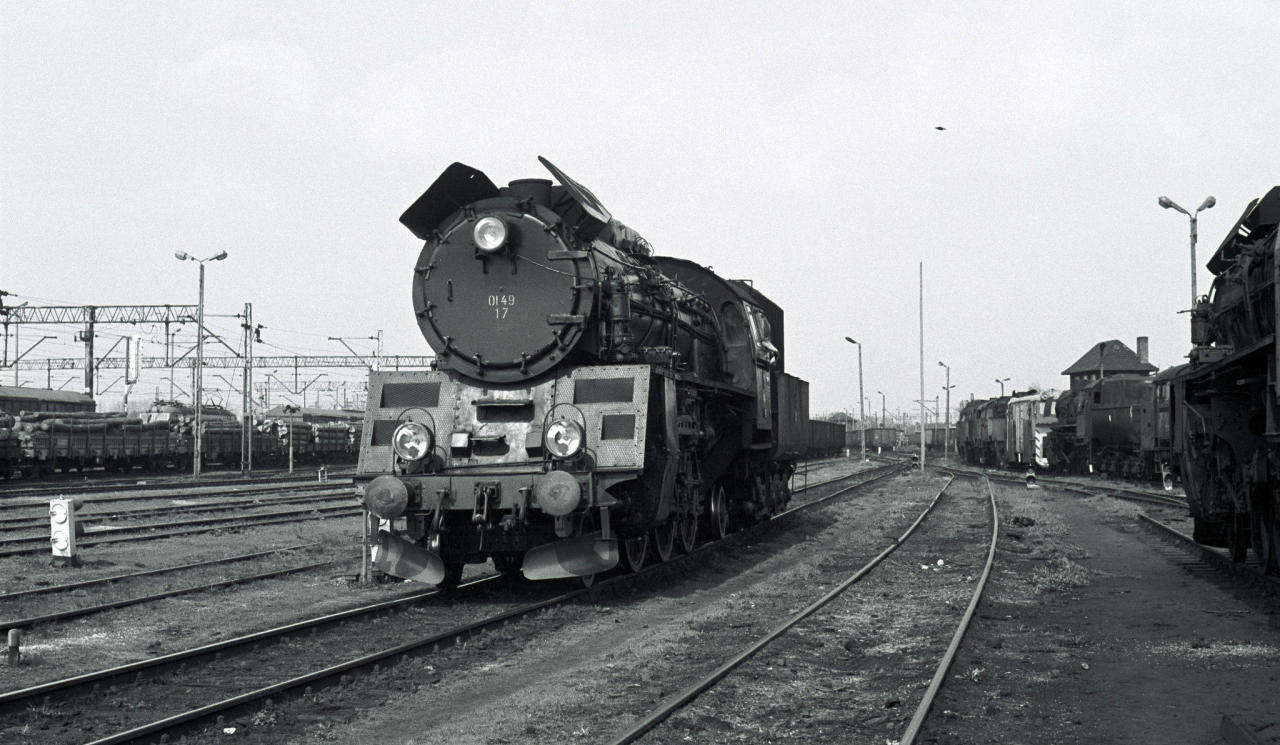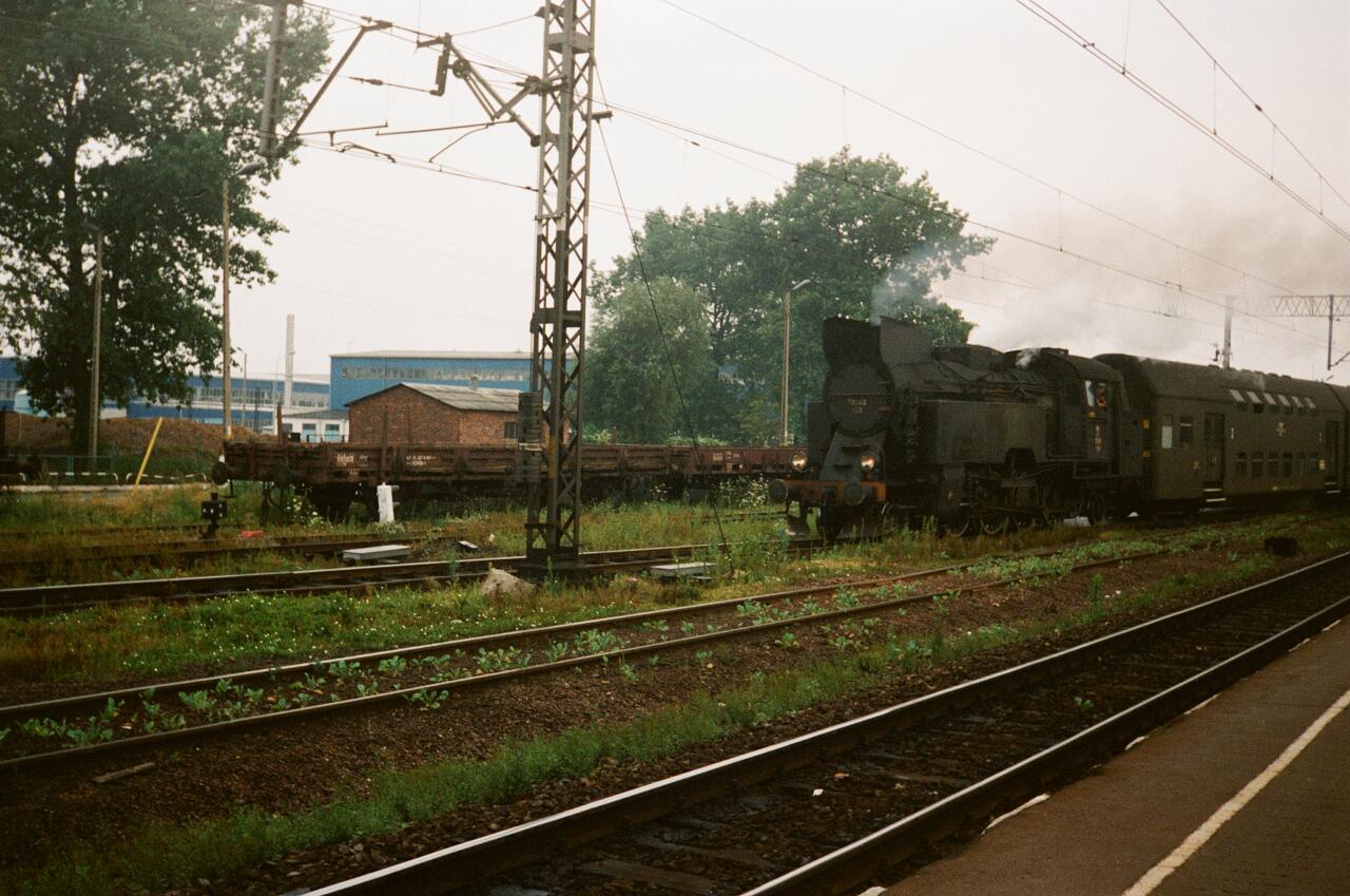 Ol49 na terenie torów trakcyjnych w Jarocinie. Z lewej strony zachodnia część stacji (ruch z Krotoszyna). Widok w kierunku północnym (perony).