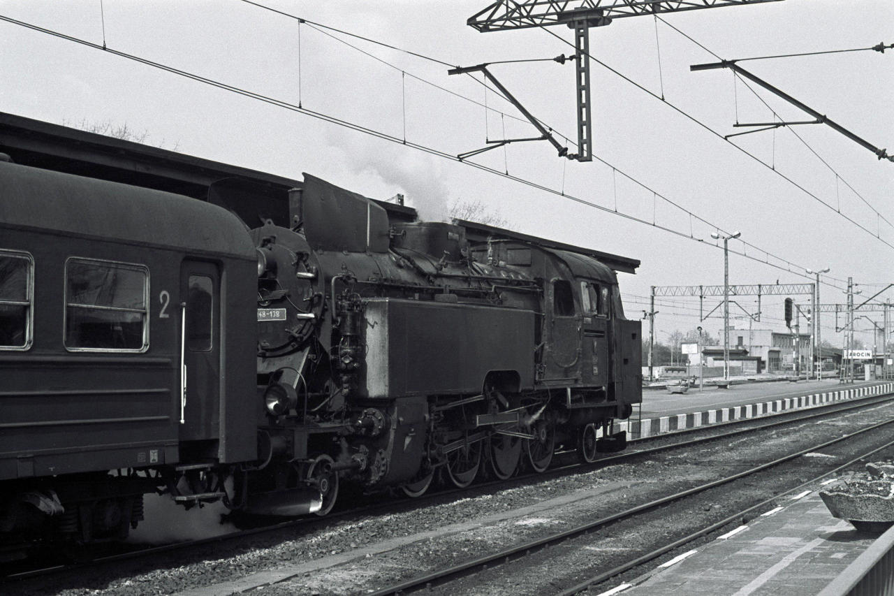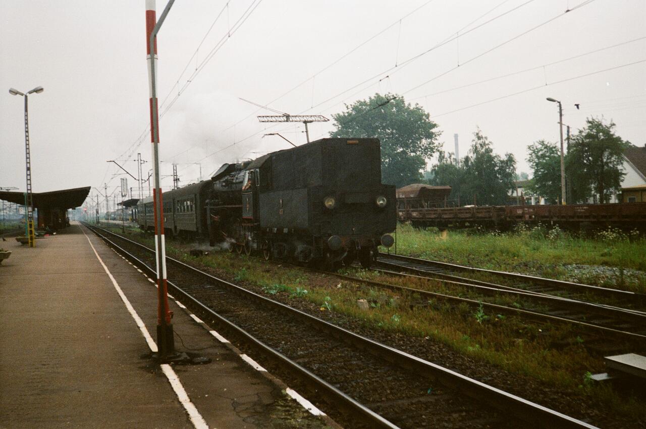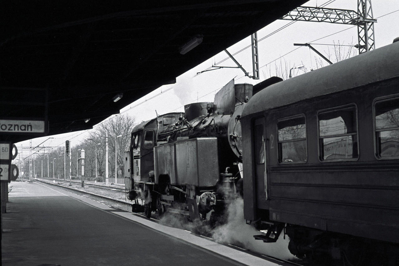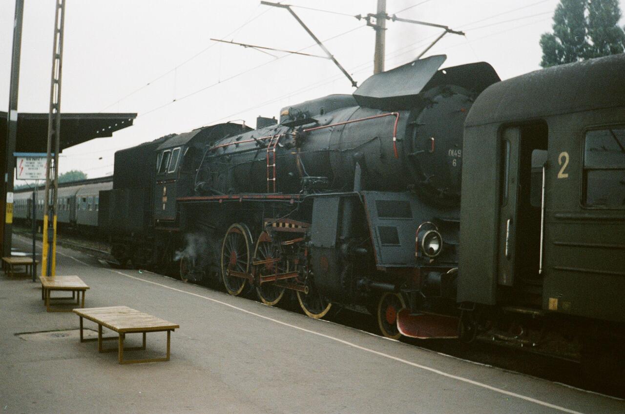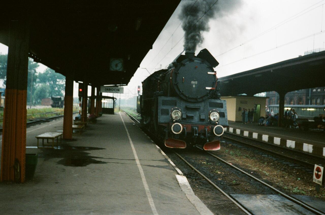 Stacja Jarocin - parowóz Ol49-6 z MD Ostrów Wielkopolski (do 30.06.1991 r. - MD Jarocin) z pociągiem M 33523 relacji Jarocin - Czempiń oczekujący na odjazd na torze 4 przy peronie 2. Z prawej fragment składu dalekobieżnego oczekującego na odjazd z peronu 1; zachodnia strona dworca. Widok w kierunku północnym; Gostyń, Śrem (przez Mieszków), Poznań, Września.
