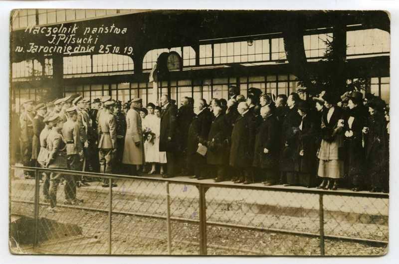 Wizyta Józefa Piłsudskiego w Jarocinie. Ze szczegółów kolejowych warto zwrócić uwagę na przeszklenia podwieszone pod krawędzią wiat sektorowych, które mają na celu ochronę pasażerów przed zacinającym deszczem.