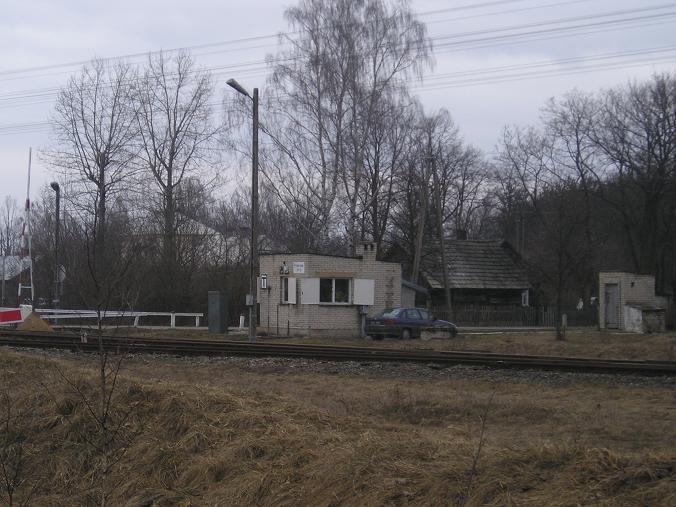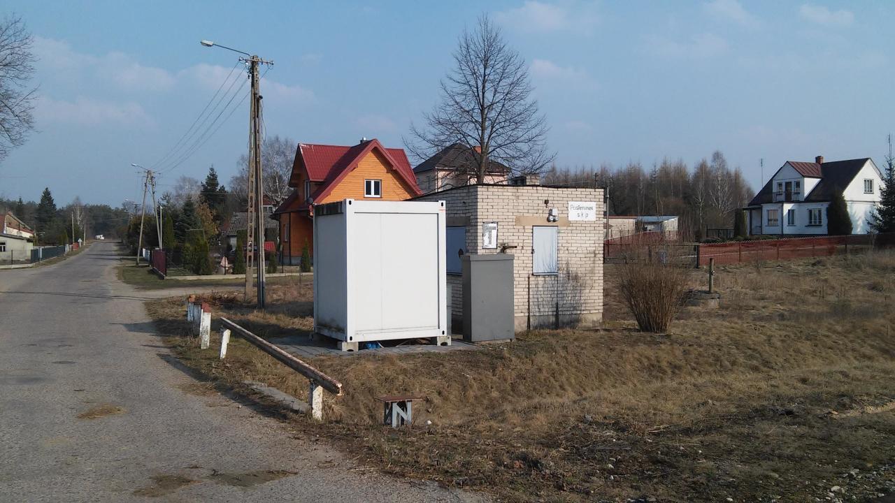 Budynek dawnego posterunku stwierdzenia końca pociągu a obok kontener nowych urządzeń przejazdowych.