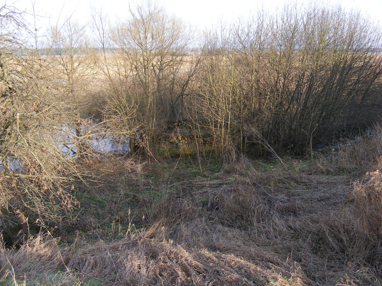 Strabla - widoczny w krzakach fragment murowanej cembrowiny po kolejowej wodokaczce.