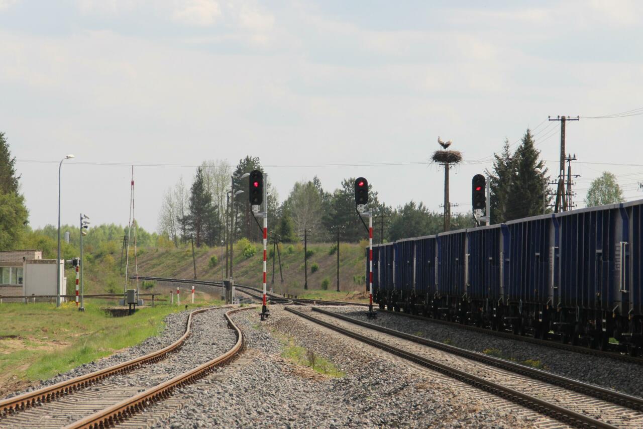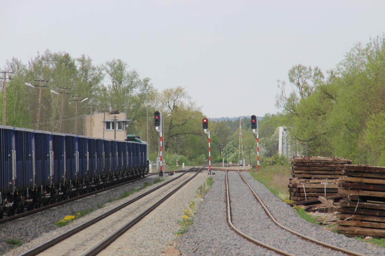 Semafory wyjazdowe w kierunku Białegostoku, skład towarowy czekający na wolną drogę oraz wystająca zza niego nastawnia.